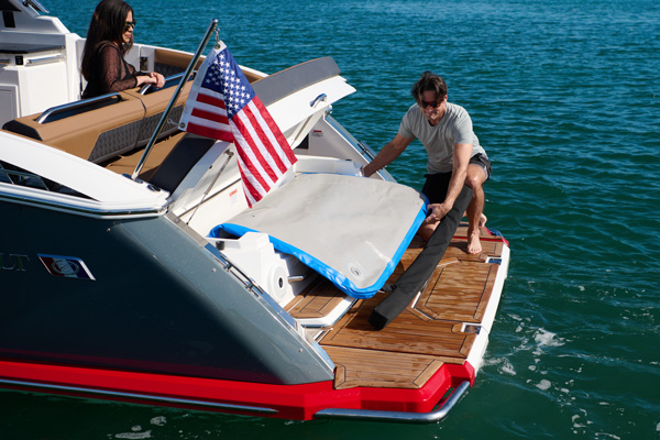 Great for water activities, the entire full-width swim platform lowers below the water hydraulically with the push of a button, offering easy access in or out of the water and into the boat.
